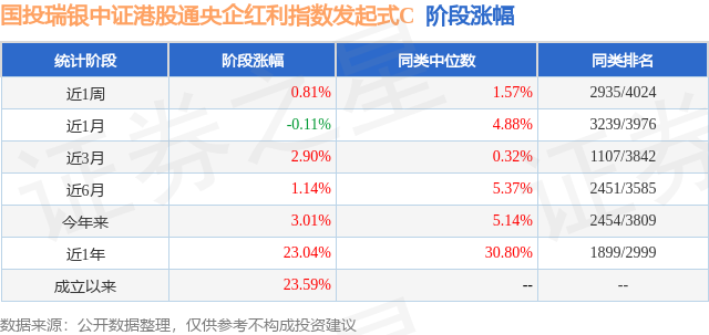 证券之星消息,日前国投瑞银中证港股通央企红利指数发起式C基金公布一季报,2026年一季度最新规模0.05亿元,季度净值涨幅为0.11%。