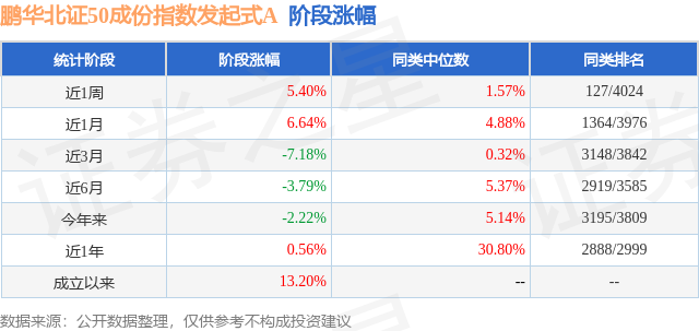 从业绩表现来看,鹏华北证50成份指数发起式A基金过去一年净值涨幅为0.56%,在同类基金中排名2888/2999,同类基金过去一年净值涨幅中位数为30.8%。而基金过去一年的最大回撤为-24.0%,成立以来的最大回撤为-27.1%。