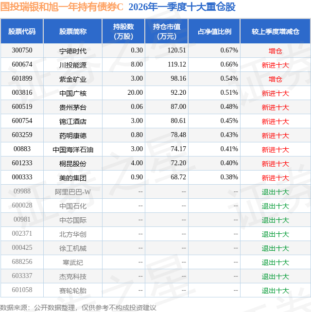 从基金规模来看,国投瑞银和旭一年持有债券C基金2026年一季度公布的基金规模为0.51亿元,较上一期规模364.76万元变化了4755.93万元,环比变化了1303.84%。该基金最新一期资产配置为:股票占净值比14.01%,债券占净值比91.36%,现金占净值比1.02%。从基金持仓来看,该基金当季前十大股票仓位达4.93%,第一大重仓股为宁德时代(300750),持仓占比为0.67%。