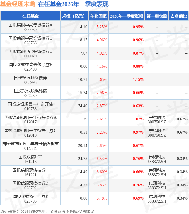 证券之星消息,日前国投瑞银和旭一年持有债券C基金公布一季报,2026年一季度最新规模0.51亿元,季度净值涨幅为0.97%。