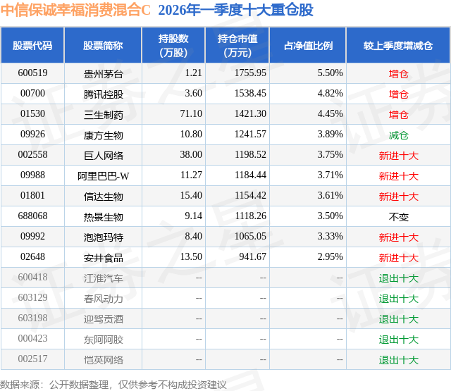 从基金规模来看,中信保诚幸福消费混合C基金2026年一季度公布的基金规模为2.36亿元,较上一期规模4.1万元变化了2.36亿元,环比变化了574505.13%。该基金最新一期资产配置为:股票占净值比93.28%,债券占净值比1.57%,现金占净值比5.81%。从基金持仓来看,该基金当季前十大股票仓位达39.51%,第一大重仓股为贵州茅台(600519),持仓占比为5.5%。