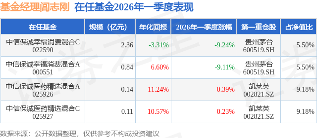证券之星消息,日前中信保诚幸福消费混合C基金公布一季报,2026年一季度最新规模2.36亿元,季度净值涨幅为-9.24%。