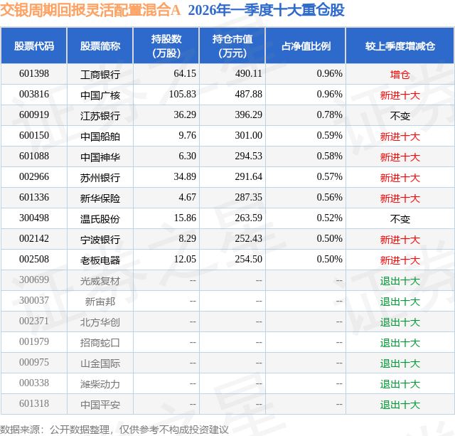 从基金规模来看,交银周期回报灵活配置混合A基金2026年一季度公布的基金规模为3.04亿元,较上一期规模3.87亿元变化了-8284.15万元,环比变化了-21.43%。该基金最新一期资产配置为:股票占净值比23.21%,债券占净值比68.57%,现金占净值比1.33%。从基金持仓来看,该基金当季前十大股票仓位达6.52%,第一大重仓股为工商银行(601398),持仓占比为0.96%。