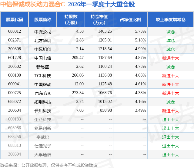证券之星消息,日前中信保诚成长动力混合C基金公布一季报,2026年一季度最新规模0.39亿元,季度净值涨幅为-3.0%。