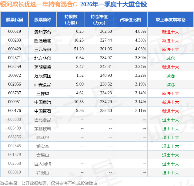 从基金规模来看,银河成长优选一年持有混合C基金2026年一季度公布的基金规模为0.13亿元,较上一期规模1979.25万元变化了-698.61万元,环比变化了-35.3%。该基金最新一期资产配置为:股票占净值比85.99%,无债券类资产,现金占净值比14.4%。从基金持仓来看,该基金当季前十大股票仓位达36.1%,第一大重仓股为贵州茅台(600519),持仓占比为4.85%。