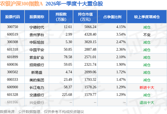 从基金规模来看,农银沪深300指数A基金2026年一季度公布的基金规模为8.06亿元,较上一期规模5.6亿元变化了2.46亿元,环比变化了43.97%。该基金最新一期资产配置为:股票占净值比94.83%,债券占净值比4.62%,现金占净值比1.37%。从基金持仓来看,该基金当季前十大股票仓位达22.29%,第一大重仓股为宁德时代(300750),持仓占比为4.15%。
