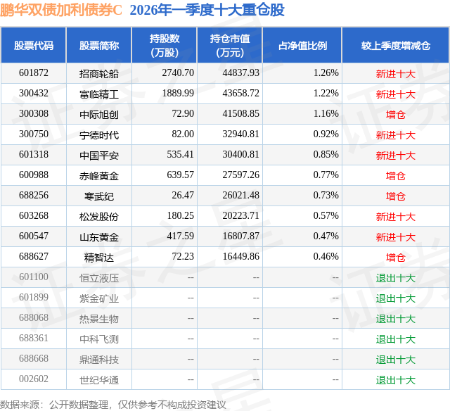 从基金规模来看,鹏华双债加利债券C基金2026年一季度公布的基金规模为33.88亿元,较上一期规模3.47亿元变化了30.41亿元,环比变化了875.45%。该基金最新一期资产配置为:股票占净值比16.94%,债券占净值比86.7%,现金占净值比2.06%。从基金持仓来看,该基金当季前十大股票仓位达8.41%,第一大重仓股为招商轮船(601872),持仓占比为1.26%。