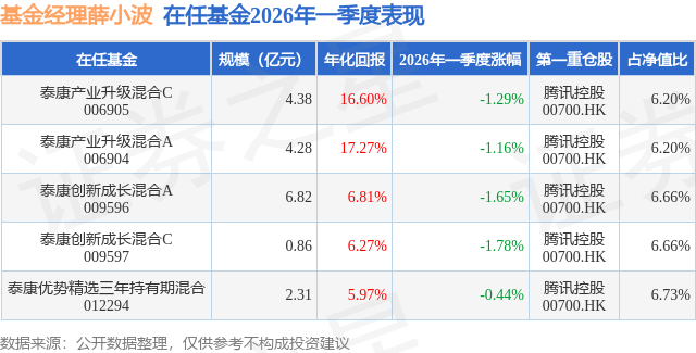 从基金规模来看,泰康优势精选三年持有期混合基金2026年一季度公布的基金规模为2.31亿元,较上一期规模3.87亿元变化了-1.57亿元,环比变化了-40.44%。该基金最新一期资产配置为:股票占净值比86.11%,无债券类资产,现金占净值比16.85%。从基金持仓来看,该基金当季前十大股票仓位达51.41%,第一大重仓股为腾讯控股(00700),持仓占比为6.73%。