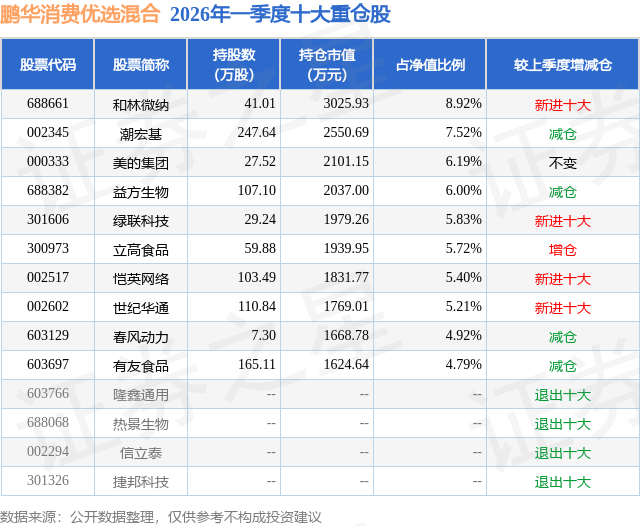 从基金规模来看,鹏华消费优选混合基金2026年一季度公布的基金规模为3.39亿元,较上一期规模4.6亿元变化了-1.21亿元,环比变化了-26.25%。该基金最新一期资产配置为:股票占净值比90.24%,无债券类资产,现金占净值比10.58%。从基金持仓来看,该基金当季前十大股票仓位达60.5%,第一大重仓股为和林微纳(688661),持仓占比为8.92%。