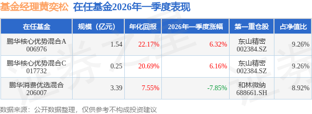 鹏华消费优选混合现任基金经理为黄奕松,本季度增聘基金经理黄奕松,近期离任的基金经理为蒋鑫。其中在任基金经理黄奕松已从业4年又127天,2025年5月23日正式接手管理鹏华消费优选混合,任职期间累计回报为2.52%。目前还管理着3只基金产品(包括A类和C类),其中本季度表现最佳的基金为鹏华核心优势混合A(006976),季度净值涨幅为6.32%。