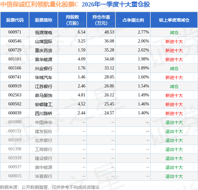 从基金规模来看,中信保诚红利领航量化股票C基金2026年一季度公布的基金规模为0.13亿元。该基金最新一期资产配置为:股票占净值比91.26%,无债券类资产,现金占净值比6.83%。从基金持仓来看,该基金当季前十大股票仓位达18.21%,第一大重仓股为恒源煤电(600971),持仓占比为2.77%。