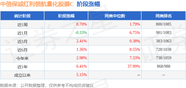 从业绩表现来看,中信保诚红利领航量化股票C基金过去一年净值涨幅为6.41%,在同类基金中排名868/988,同类基金过去一年净值涨幅中位数为37.99%。而基金过去一年的最大回撤为-5.58%,成立以来的最大回撤为-7.05%。