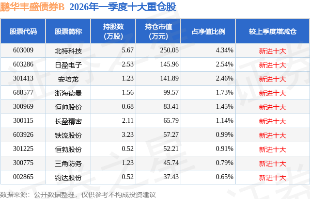 从基金规模来看,鹏华丰盛债券B基金2026年一季度公布的基金规模为0.57亿元,较上一期规模1.23亿元变化了-6593.9万元,环比变化了-53.48%。该基金最新一期资产配置为:股票占净值比19.95%,债券占净值比110.84%,现金占净值比8.26%。从基金持仓来看,该基金当季前十大股票仓位达17.0%,第一大重仓股为北特科技(603009),持仓占比为4.34%。