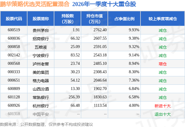 从基金规模来看,鹏华策略优选灵活配置混合基金2026年一季度公布的基金规模为2.78亿元,较上一期规模3.94亿元变化了-1.15亿元,环比变化了-29.32%。该基金最新一期资产配置为:股票占净值比93.87%,无债券类资产,现金占净值比6.3%。从基金持仓来看,该基金当季前十大股票仓位达79.79%,第一大重仓股为贵州茅台(600519),持仓占比为9.93%。