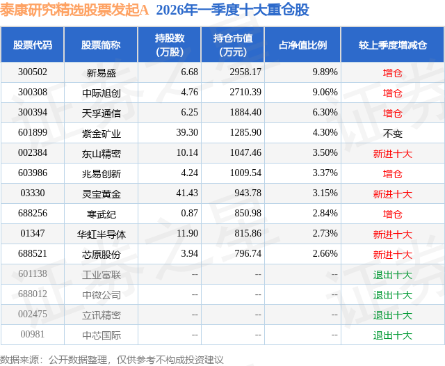 从基金规模来看,泰康研究精选股票发起A基金2026年一季度公布的基金规模为1.21亿元,较上一期规模1735.55万元变化了1.03亿元,环比变化了594.72%。该基金最新一期资产配置为:股票占净值比82.47%,债券占净值比0.58%,现金占净值比16.64%。从基金持仓来看,该基金当季前十大股票仓位达47.8%,第一大重仓股为新易盛(300502),持仓占比为9.89%。