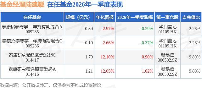 证券之星消息,日前泰康研究精选股票发起A基金公布一季报,2026年一季度最新规模1.21亿元,季度净值涨幅为1.02%。