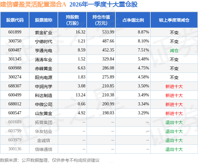从基金规模来看,建信睿盈灵活配置混合A基金2026年一季度公布的基金规模为0.47亿元,较上一期规模4060.93万元变化了614.92万元,环比变化了15.14%。该基金最新一期资产配置为:股票占净值比89.45%,无债券类资产,现金占净值比10.56%。从基金持仓来看,该基金当季前十大股票仓位达52.91%,第一大重仓股为紫金矿业(601899),持仓占比为8.87%。