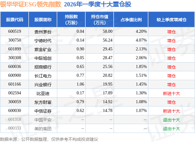 从基金规模来看,银华华证ESG领先指数基金2026年一季度公布的基金规模为0.14亿元,较上一期规模5121.48万元变化了-3741.13万元,环比变化了-73.05%。该基金最新一期资产配置为:股票占净值比93.82%,无债券类资产,现金占净值比6.21%。从基金持仓来看,该基金当季前十大股票仓位达20.72%,第一大重仓股为贵州茅台(600519),持仓占比为4.2%。