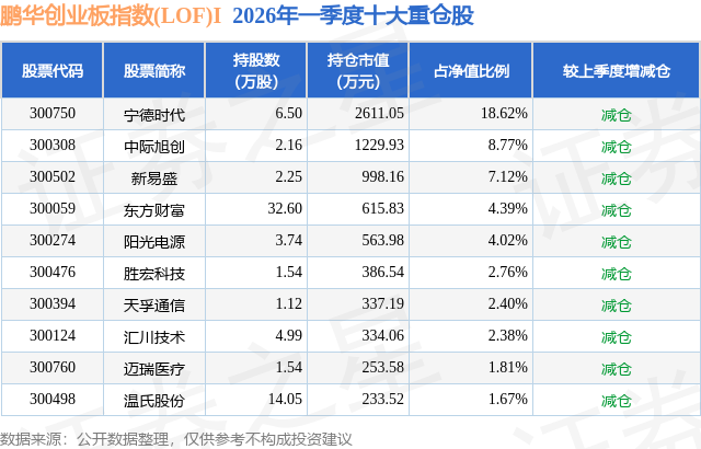 从基金规模来看,鹏华创业板指数(LOF)I基金2026年一季度公布的基金规模为0.01亿元。该基金最新一期资产配置为:股票占净值比94.48%,无债券类资产,现金占净值比5.73%。从基金持仓来看,该基金当季前十大股票仓位达53.94%,第一大重仓股为宁德时代(300750),持仓占比为18.62%。