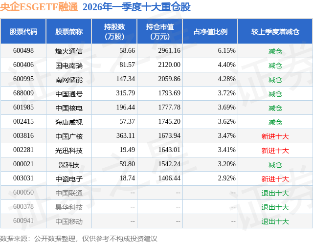 从基金规模来看,央企ESGETF融通基金2026年一季度公布的基金规模为4.82亿元,较上一期规模8.97亿元变化了-4.15亿元,环比变化了-46.29%。该基金最新一期资产配置为:股票占净值比98.69%,无债券类资产,现金占净值比1.16%。从基金持仓来看,该基金当季前十大股票仓位达38.86%,第一大重仓股为烽火通信(600498),持仓占比为6.15%。