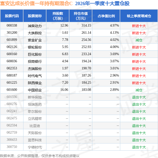 从基金规模来看,富安达成长价值一年持有期混合C基金2026年一季度公布的基金规模为0.03亿元,较上一期规模365.1万元变化了-86.87万元,环比变化了-23.79%。该基金最新一期资产配置为:股票占净值比70.86%,无债券类资产,现金占净值比29.32%。从基金持仓来看,该基金当季前十大股票仓位达35.65%,第一大重仓股为潍柴动力(000338),持仓占比为4.97%。