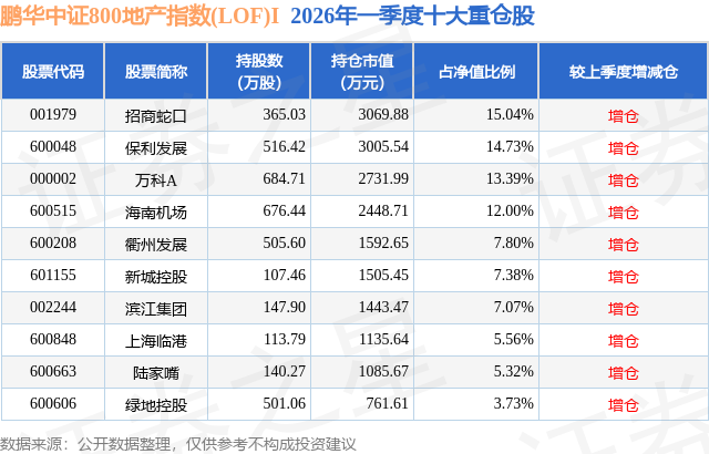 从基金规模来看,鹏华中证800地产指数(LOF)I基金2026年一季度公布的基金规模为0.0亿元。该基金最新一期资产配置为:股票占净值比94.49%,无债券类资产,现金占净值比5.91%。从基金持仓来看,该基金当季前十大股票仓位达92.02%,第一大重仓股为招商蛇口(001979),持仓占比为15.04%。