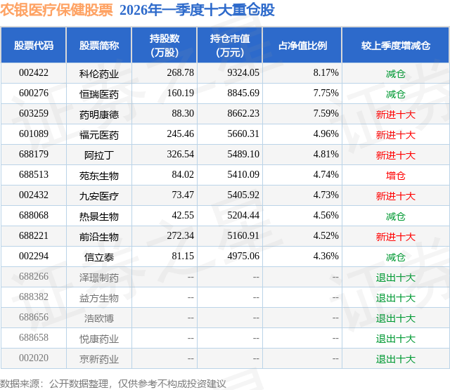 从基金规模来看,农银医疗保健股票基金2026年一季度公布的基金规模为11.42亿元,较上一期规模13.03亿元变化了-1.62亿元,环比变化了-12.39%。该基金最新一期资产配置为:股票占净值比93.63%,无债券类资产,现金占净值比6.59%。从基金持仓来看,该基金当季前十大股票仓位达56.19%,第一大重仓股为科伦药业(002422),持仓占比为8.17%。