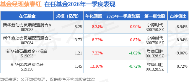 从基金规模来看,新华钻石品质企业混合基金2026年一季度公布的基金规模为1.21亿元,较上一期规模1.11亿元变化了957.38万元,环比变化了8.61%。该基金最新一期资产配置为:股票占净值比89.9%,无债券类资产,现金占净值比8.45%。从基金持仓来看,该基金当季前十大股票仓位达40.27%,第一大重仓股为登康口腔(001328),持仓占比为9.06%。