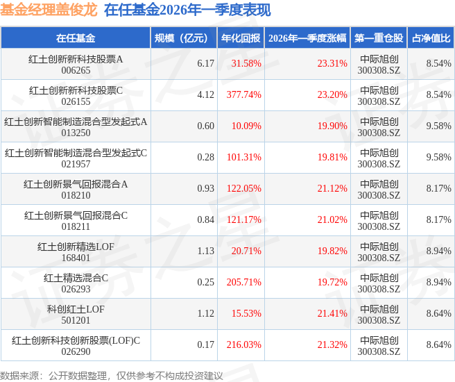 从基金规模来看,红土创新智能制造混合型发起式A基金2026年一季度公布的基金规模为0.6亿元,较上一期规模6275.6万元变化了-257.92万元,环比变化了-4.11%。该基金最新一期资产配置为:股票占净值比92.51%,无债券类资产,现金占净值比7.16%。从基金持仓来看,该基金当季前十大股票仓位达49.67%,第一大重仓股为中际旭创(300308),持仓占比为9.58%。