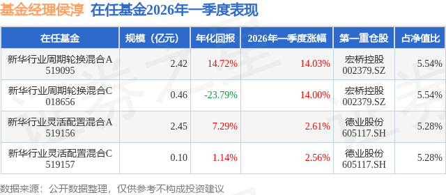 新华行业周期轮换混合A现任基金经理为侯淳,本季度增聘基金经理侯淳,近期离任的基金经理为张大江。其中在任基金经理侯淳已从业1年又76天,2026年3月24日正式接手管理新华行业周期轮换混合A,任职期间累计回报为8.72%。目前还管理着4只基金产品(包括A类和C类),其中本季度表现最佳的基金为新华行业周期轮换混合A(519095),季度净值涨幅为14.03%。