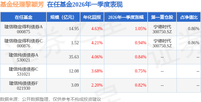 证券之星消息,日前建信稳定得利债券A基金公布一季报,2026年一季度最新规模14.95亿元,季度净值涨幅为1.05%。