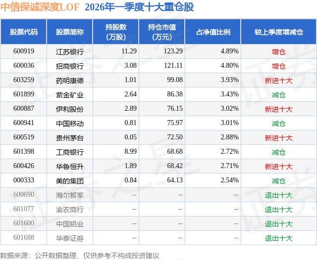 从基金规模来看,中信保诚深度LOF基金2026年一季度公布的基金规模为0.25亿元,较上一期规模1.43亿元变化了-1.18亿元,环比变化了-82.35%。该基金最新一期资产配置为:股票占净值比80.49%,债券占净值比9.17%,现金占净值比10.12%。从基金持仓来看,该基金当季前十大股票仓位达33.93%,第一大重仓股为江苏银行(600919),持仓占比为4.89%。