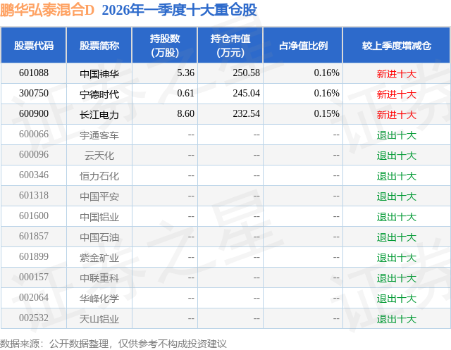 从基金规模来看,鹏华弘泰混合D基金2026年一季度公布的基金规模为2.52亿元,较上一期规模0.21万元变化了2.52亿元,环比变化了12.0万倍。该基金最新一期资产配置为:股票占净值比0.47%,债券占净值比118.82%,现金占净值比1.19%。从基金持仓来看,该基金当季前十大股票仓位达0.47%,第一大重仓股为中国神华(601088),持仓占比为0.16%。