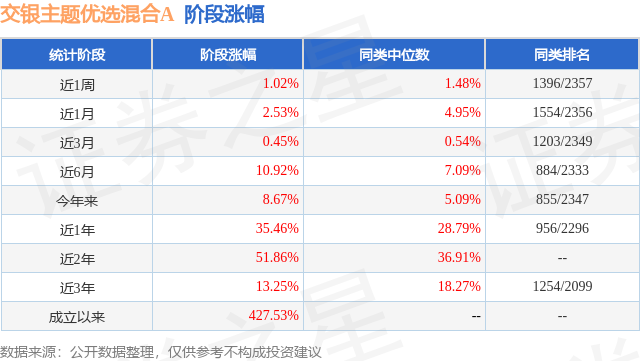 从业绩表现来看,交银主题优选混合A基金过去一年净值涨幅为35.46%,在同类基金中排名956/2296,同类基金过去一年净值涨幅中位数为28.79%。而基金过去一年的最大回撤为-7.54%,成立以来的最大回撤为-41.31%。