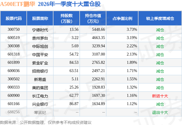 从基金规模来看,A500ETF鹏华基金2026年一季度公布的基金规模为14.6亿元,较上一期规模22.25亿元变化了-7.65亿元,环比变化了-34.39%。该基金最新一期资产配置为:股票占净值比98.87%,无债券类资产,现金占净值比1.18%。从基金持仓来看,该基金当季前十大股票仓位达20.02%,第一大重仓股为宁德时代(300750),持仓占比为3.73%。