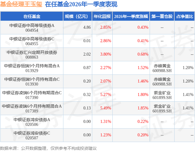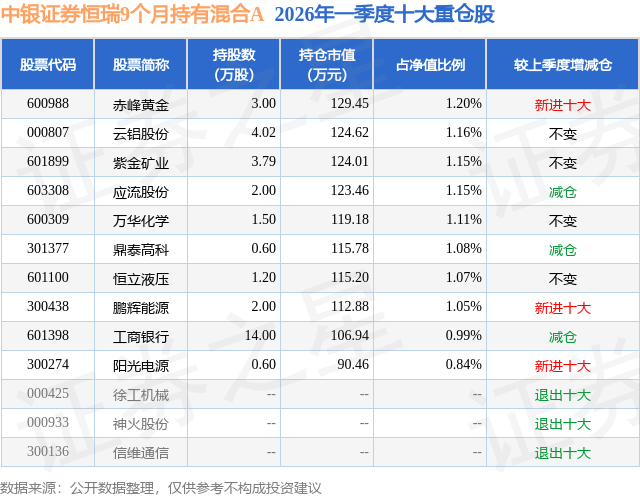 从基金规模来看,中银证券恒瑞9个月持有混合A基金2026年一季度公布的基金规模为0.87亿元,较上一期规模2.67亿元变化了-1.8亿元,环比变化了-67.31%。该基金最新一期资产配置为:股票占净值比21.65%,债券占净值比96.1%,现金占净值比1.6%。从基金持仓来看,该基金当季前十大股票仓位达10.8%,第一大重仓股为赤峰黄金(600988),持仓占比为1.2%。