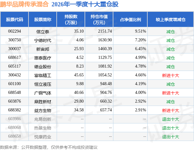 从基金规模来看,鹏华品牌传承混合基金2026年一季度公布的基金规模为2.26亿元,较上一期规模2.29亿元变化了-291.38万元,环比变化了-1.27%。该基金最新一期资产配置为:股票占净值比91.68%,无债券类资产,现金占净值比9.03%。从基金持仓来看,该基金当季前十大股票仓位达51.61%,第一大重仓股为信立泰(002294),持仓占比为9.51%。