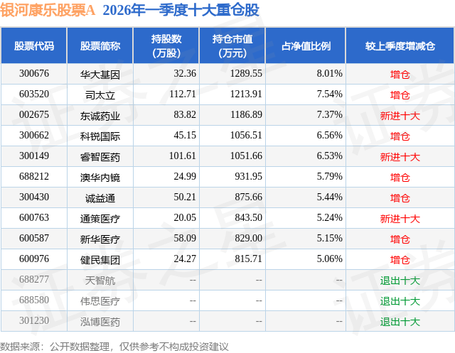 从基金规模来看,银河康乐股票A基金2026年一季度公布的基金规模为1.44亿元,较上一期规模1.38亿元变化了620.09万元,环比变化了4.48%。该基金最新一期资产配置为:股票占净值比93.63%,无债券类资产,现金占净值比6.8%。从基金持仓来看,该基金当季前十大股票仓位达62.69%,第一大重仓股为华大基因(300676),持仓占比为8.01%。