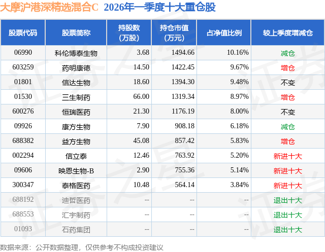 从基金规模来看,大摩沪港深精选混合C基金2026年一季度公布的基金规模为1.02亿元,较上一期规模1.28亿元变化了-2572.8万元,环比变化了-20.1%。该基金最新一期资产配置为:股票占净值比94.26%,无债券类资产,现金占净值比7.18%。从基金持仓来看,该基金当季前十大股票仓位达72.47%,第一大重仓股为科伦博泰生物(06990),持仓占比为10.16%。