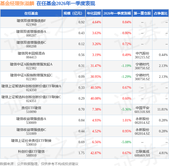 证券之星消息,日前责任ETF建信基金公布一季报,2026年一季度最新规模0.7亿元,季度净值涨幅为-5.36%。