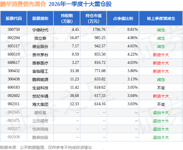 从基金规模来看,鹏华消费领先混合基金2026年一季度公布的基金规模为2.03亿元,较上一期规模2.21亿元变化了-1774.25万元,环比变化了-8.04%。该基金最新一期资产配置为:股票占净值比77.68%,无债券类资产,现金占净值比6.21%。从基金持仓来看,该基金当季前十大股票仓位达42.62%,第一大重仓股为宁德时代(300750),持仓占比为8.81%。