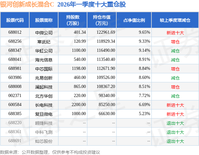 从基金规模来看,银河创新成长混合C基金2026年一季度公布的基金规模为30.06亿元,较上一期规模20.38亿元变化了9.68亿元,环比变化了47.52%。该基金最新一期资产配置为:股票占净值比92.64%,无债券类资产,现金占净值比6.37%。从基金持仓来看,该基金当季前十大股票仓位达82.62%,第一大重仓股为中微公司(688012),持仓占比为9.65%。