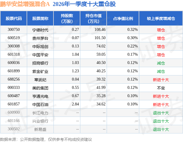 从基金规模来看,鹏华安益增强混合A基金2026年一季度公布的基金规模为0.0亿元,较上一期规模1.31万元变化了32.42万元,环比变化了2476.14%。该基金最新一期资产配置为:股票占净值比11.21%,债券占净值比104.84%,现金占净值比13.71%。从基金持仓来看,该基金当季前十大股票仓位达1.69%,第一大重仓股为宁德时代(300750),持仓占比为0.32%。