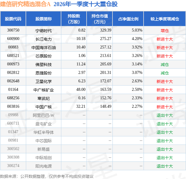 从基金规模来看,建信研究精选混合A基金2026年一季度公布的基金规模为0.39亿元,较上一期规模3939.36万元变化了-61.82万元,环比变化了-1.57%。该基金最新一期资产配置为:股票占净值比84.18%,无债券类资产,现金占净值比18.32%。从基金持仓来看,该基金当季前十大股票仓位达32.35%,第一大重仓股为宁德时代(300750),持仓占比为5.03%。