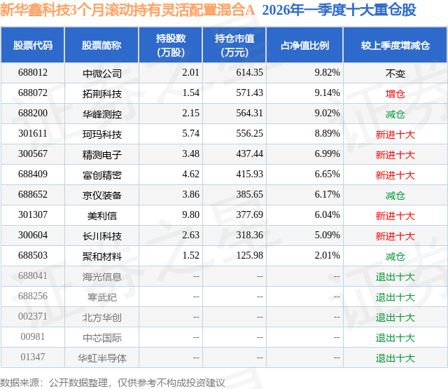从基金规模来看,新华鑫科技3个月滚动持有灵活配置混合A基金2026年一季度公布的基金规模为0.48亿元,较上一期规模8957.39万元变化了-4137.63万元,环比变化了-46.19%。该基金最新一期资产配置为:股票占净值比76.17%,无债券类资产,现金占净值比24.51%。从基金持仓来看,该基金当季前十大股票仓位达69.82%,第一大重仓股为中微公司(688012),持仓占比为9.82%。