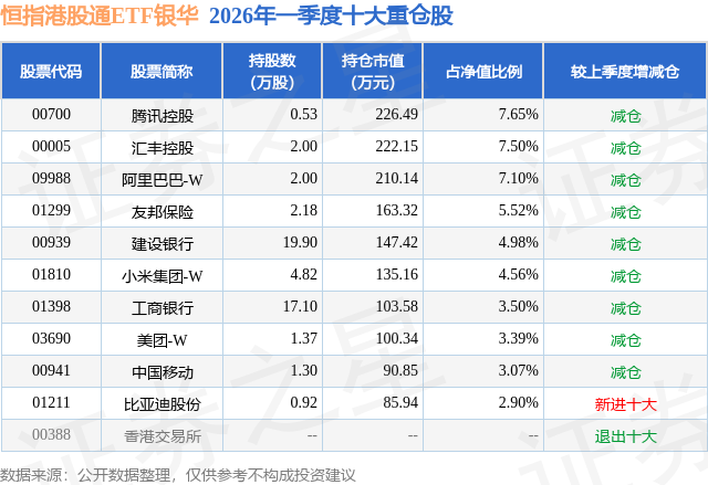 从基金规模来看,恒指港股通ETF银华基金2026年一季度公布的基金规模为0.3亿元,较上一期规模5741.19万元变化了-2780.22万元,环比变化了-48.43%。该基金最新一期资产配置为:股票占净值比96.46%,无债券类资产,现金占净值比3.6%。从基金持仓来看,该基金当季前十大股票仓位达50.17%,第一大重仓股为腾讯控股(00700),持仓占比为7.65%。