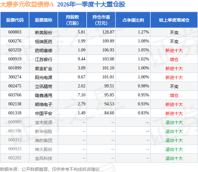 从基金规模来看,大摩多元收益债券A基金2026年一季度公布的基金规模为0.65亿元,较上一期规模1.08亿元变化了-4358.78万元,环比变化了-40.3%。该基金最新一期资产配置为:股票占净值比18.9%,债券占净值比115.97%,现金占净值比3.41%。从基金持仓来看,该基金当季前十大股票仓位达10.11%,第一大重仓股为新奥股份(600803),持仓占比为1.27%。