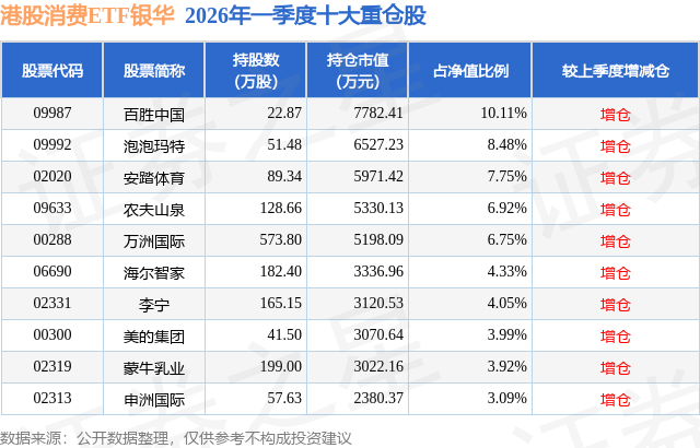 从基金规模来看,港股消费ETF银华基金2026年一季度公布的基金规模为7.7亿元,较上一期规模7.26亿元变化了4410.2万元,环比变化了6.07%。该基金最新一期资产配置为:股票占净值比98.09%,无债券类资产,现金占净值比2.22%。从基金持仓来看,该基金当季前十大股票仓位达59.39%,第一大重仓股为百胜中国(09987),持仓占比为10.11%。