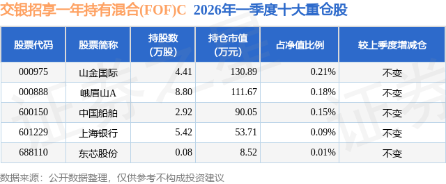 从基金规模来看,交银招享一年持有混合(FOF)C基金2026年一季度公布的基金规模为1.77亿元,较上一期规模6.34亿元变化了-4.58亿元,环比变化了-72.15%。该基金最新一期资产配置为:股票占净值比0.64%,债券占净值比5.94%,现金占净值比1.0%。从基金持仓来看,该基金当季前十大股票仓位达0.64%,第一大重仓股为山金国际(000975),持仓占比为0.21%。
