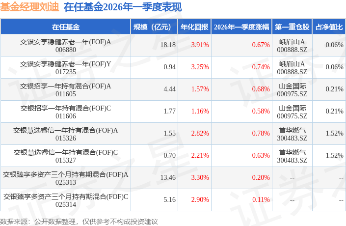 证券之星消息,日前交银招享一年持有混合(FOF)C基金公布一季报,2026年一季度最新规模1.77亿元,季度净值涨幅为0.58%。